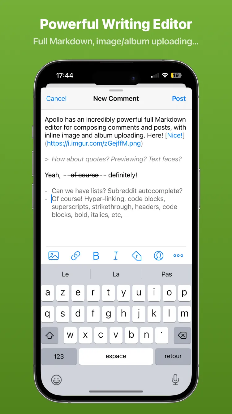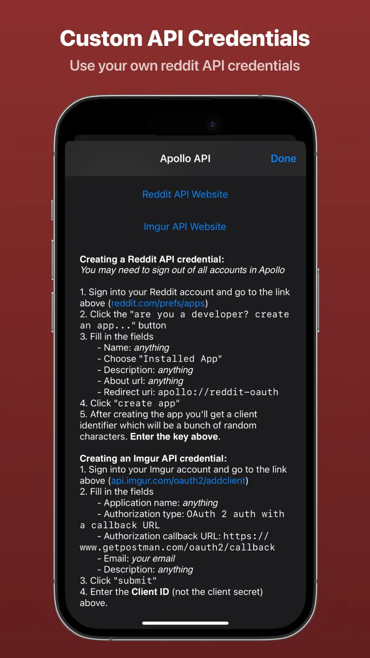 Apollo is a beautiful and powerful Reddit app designed for fast navigation, customizability, and a seamless browsing experience. Built with iOS design guidelines in mind, Apollo fits right at home on your device and offers a super-charged Media Viewer, fully customizable gestures, and much more. This version of Apollo has been tweaked with ImprovedCustomApi, which allows the app to use your own Reddit API credentials.